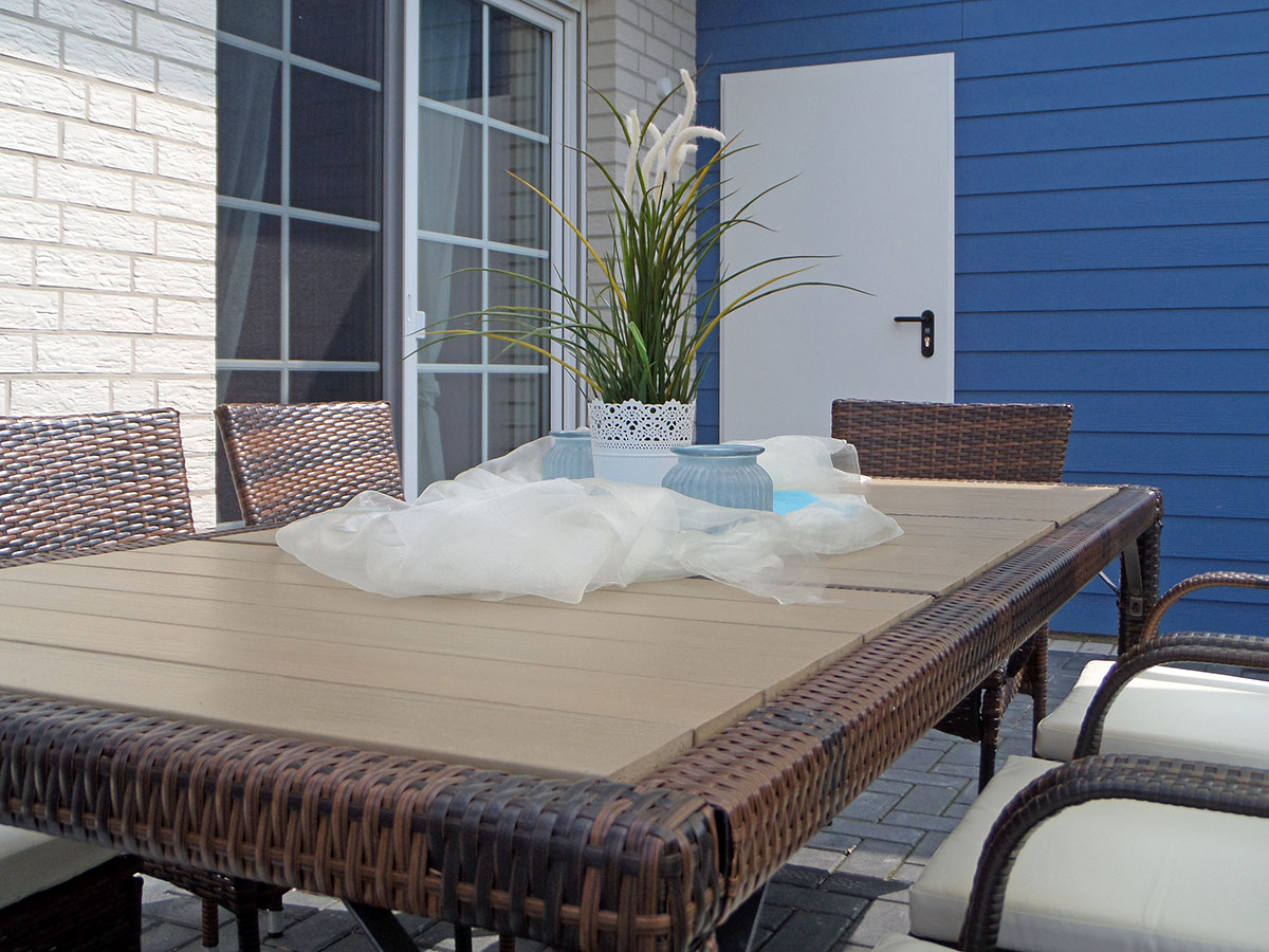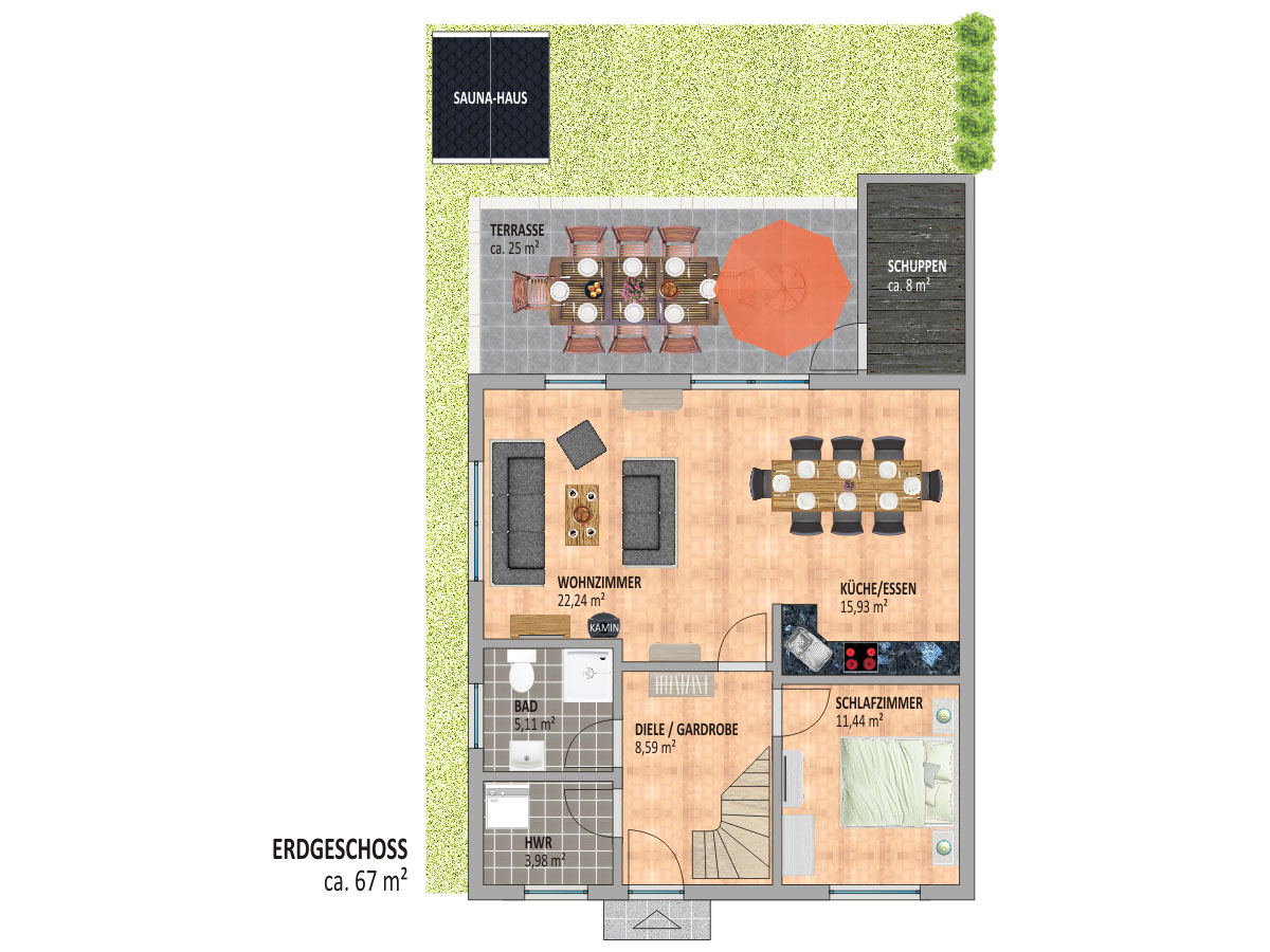 Alle Zimmer sind mit elektrischen Rollläden ausgestattet und verfügen über eine Fußbodenheizung. Im Abstellraum finden Sie Trockner und Waschmaschine. Eine umfangreiche Kinderausstattung (z. B. Kindergeschirr, Kinderhochstuhl, Kinderbesteck) ist vorhanden. Im Garten haben Sie in jeder Doppelhaushälfte viel Platz auf Ihrer Terrasse, Kinder können auf dem Rasen spielen und die eigene Gartensauna bietet Ihnen herrliche Entspannung. |