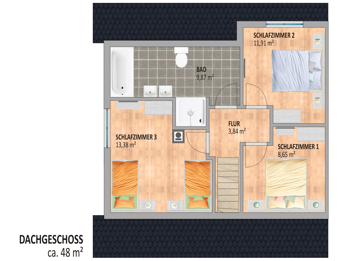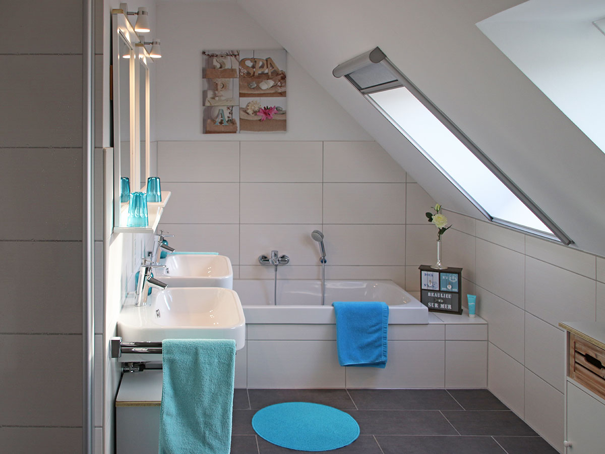 Die Häuser verfügen beide über je vier geräumige Schlafzimmer, eines davon im Erdgeschoss, die alle mit einem LCD-Fernseher und viel Stauraum ausgestattet sind. Im Dachgeschoss finden Sie in beiden Häusern ein tageslichthelles, großes Bad mit Badewanne, Dusche, WC und zwei Waschbecken. Ein zweites Bad mit Dusche finden Sie im Erdgeschoss.
